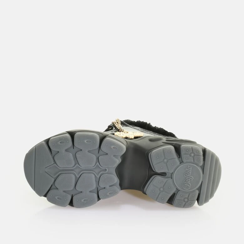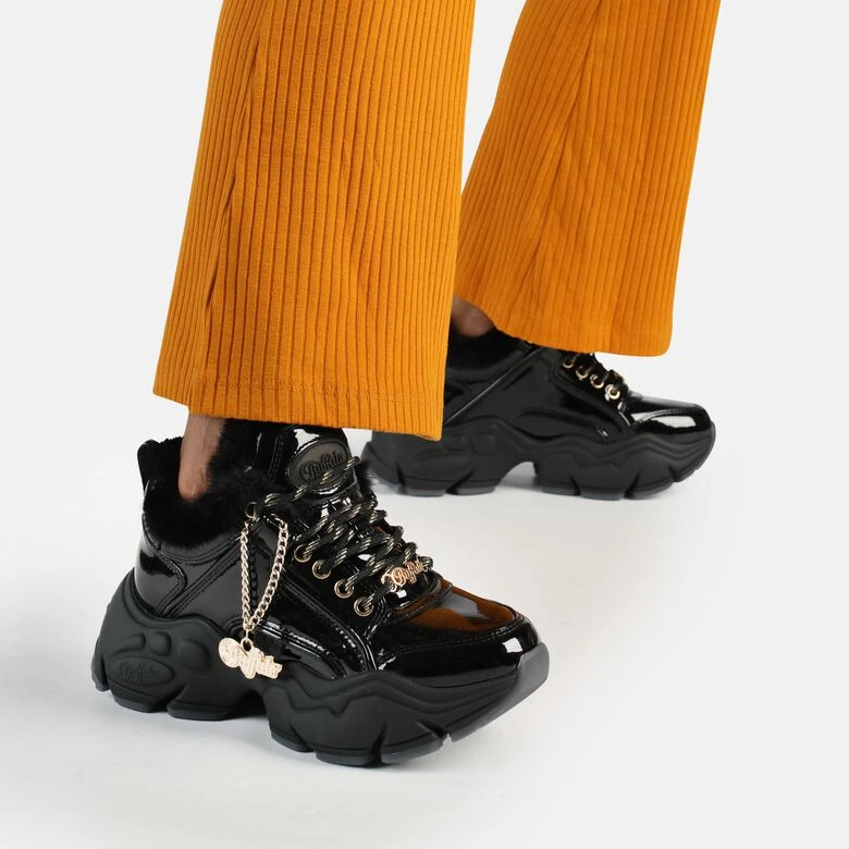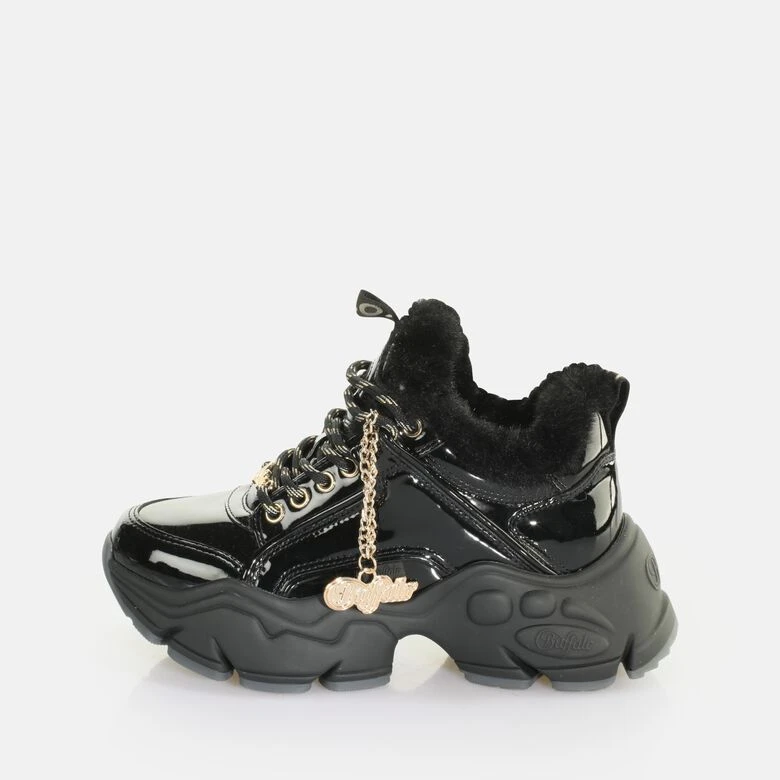Ein Sneaker auch an kalten Tagen? Mit dem veganen Binary C Warm Sneaker Low machst Du genau das möglich. Der heiße Sneaker kommt in einem stylischen schwarzen Lack und kuscheligen Felldetails. Goldene Highlights sorgen für einen atemberaubenden Glam-Faktor. Neben der charakteristischen Chunky-Plateausohle bietet der superleichte Fashion Sneaker einen stylischen Anhänger in Gold. Genieße dank der herausnehmbaren Decksohle aus Memory Foam höchsten Komfort.